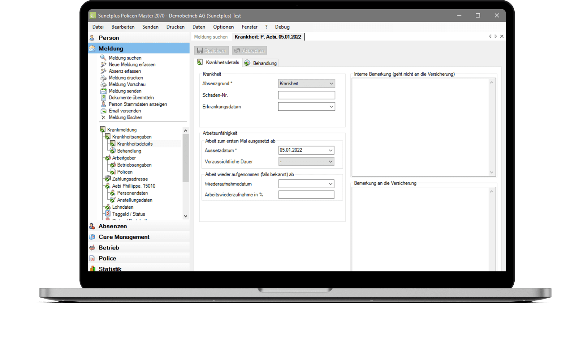 Sunetplus vereinfacht Ihre Schaden- und Absenzenmanagement – digital übermittelt an alle Versicherer, lokal gespeichert, mit klaren Auswertungen fürs Risikomanagement.