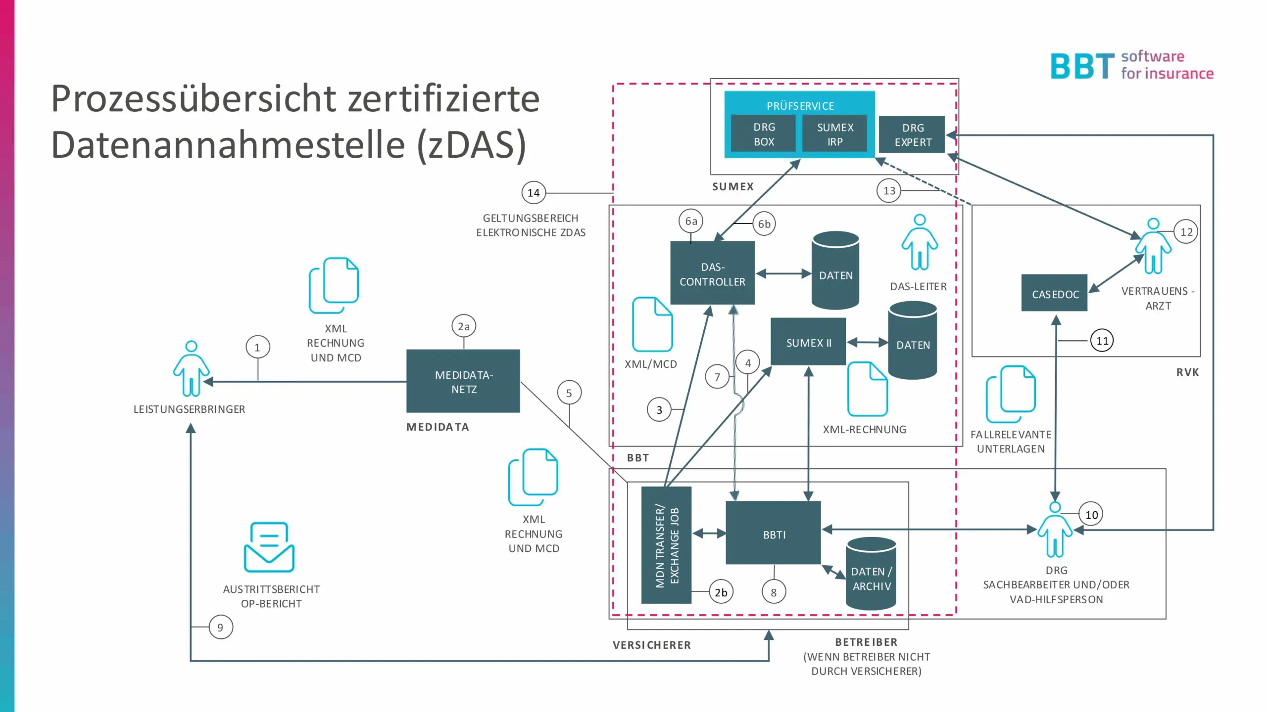 Die BBT Software AG (BBT) bietet Ihnen als weitere Dienstleistung eine zertifizierte Datenannahmestelle (zDAS). Zum Hintergrund: Mit Einführung der Diagnosis-Related-Groups-Pauschalen (DRG) zur Abgeltung von stationären Spitalaufenthalten sind Spitäler und Ärzte seit dem 1. April 2014 dazu verpflichtet, die administrativen und medizinischen Patientendaten – gleichzeitig mit der Rechnung – ausschliesslich an von Versicherern zertifizierte Datenannahmestellen zu übermitteln. Spitalrechnungen (DRG Invoices) werden deshalb zusammen mit einem sogenannten Minimal Clinical Dataset (MCD) an die Kostenträger versendet. MCD enthalten, neben administrativen Daten, auch die für die Rechnungskontrolle erforderlichen medizinischen Patientendaten. Hierbei handelt es sich um besonders schützenswerte Daten, weshalb ihr Schutz durchgehend gewährleistet sein muss. Die zertifizierte Datenannahmestelle von BBT stellt die strenge Einhaltung aller datenschutzrechtlichen Bestimmungen zur Verarbeitung von MCD und DRG-Rechnungen jederzeit für Sie sicher.
